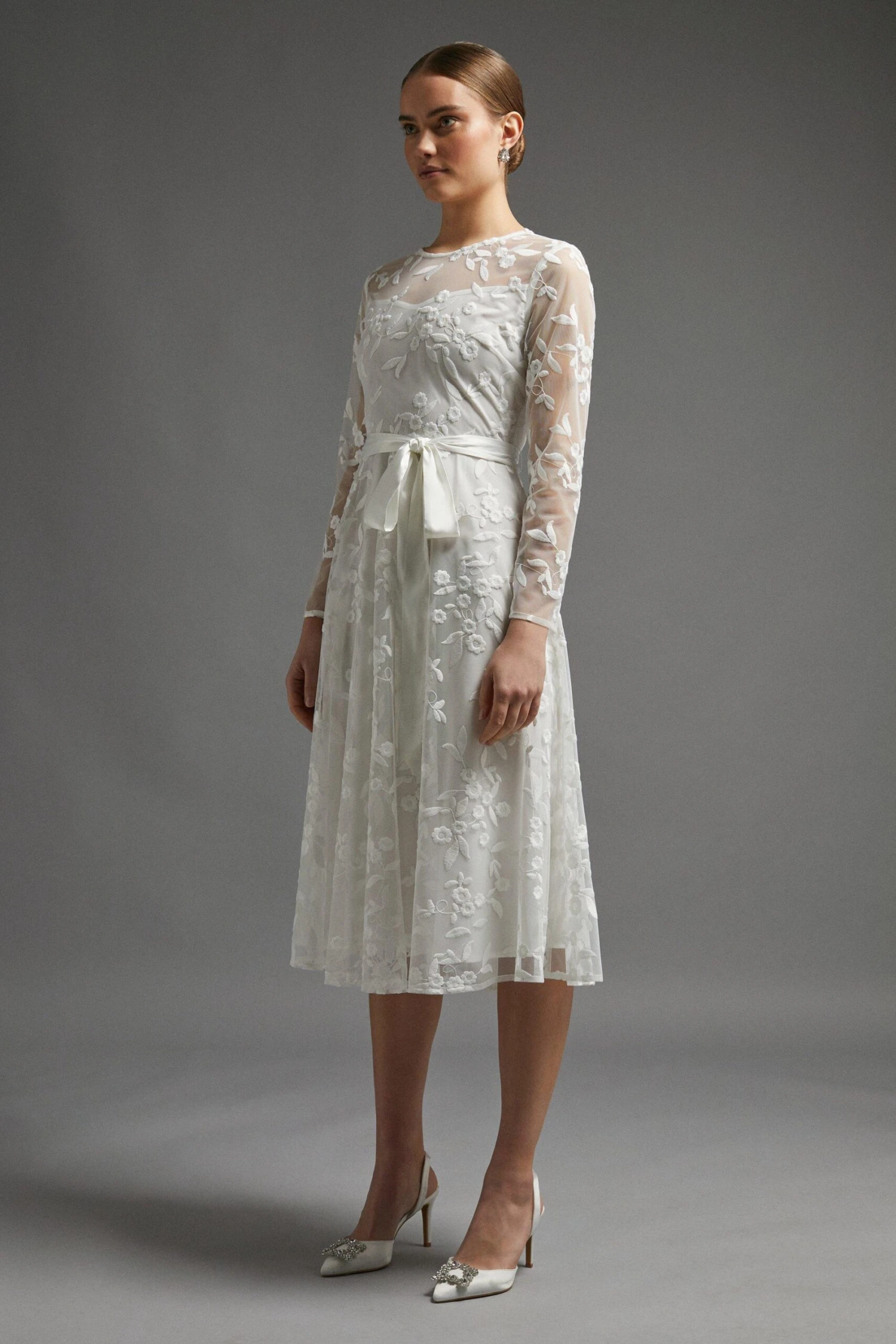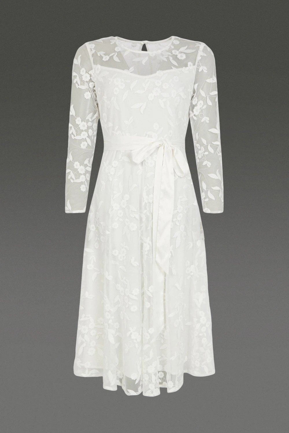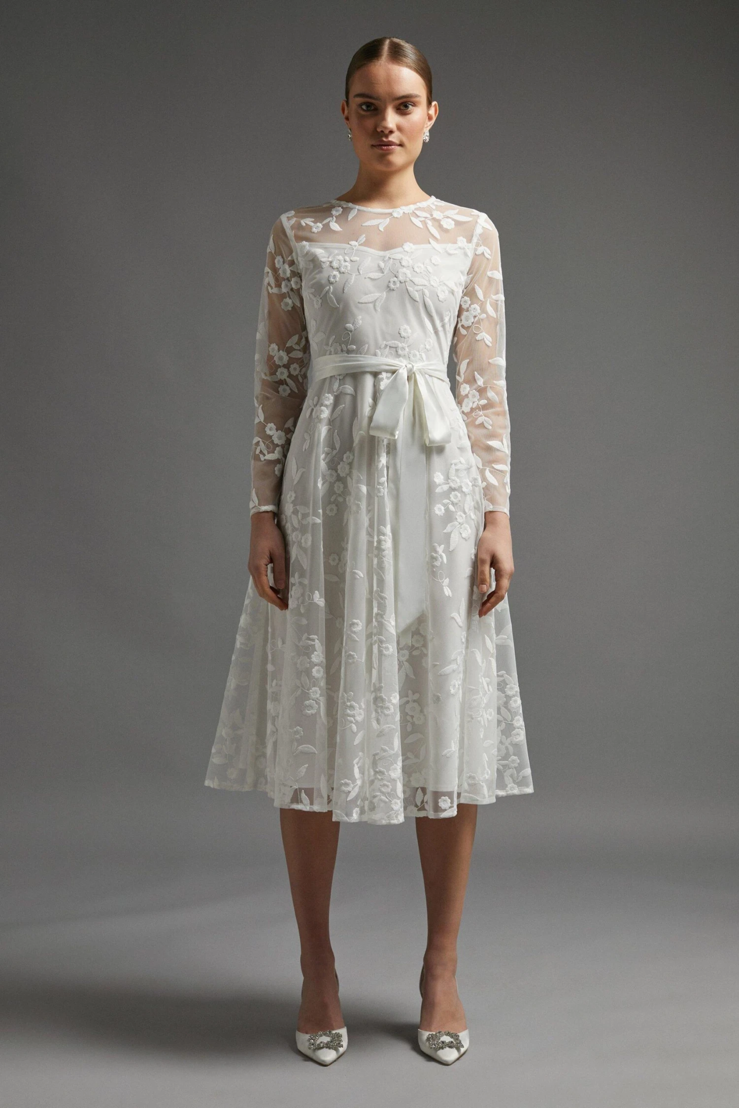 Take your imagination to a more romantic era with this exceptionally elegant bridal midi dress. Abloom with floral embroidery, it features a semi-sheer overlay, long sleeves and a satin ribbon belt to define your waistline. Style it with simple ivory accessories to let the intricate embroidery shine.