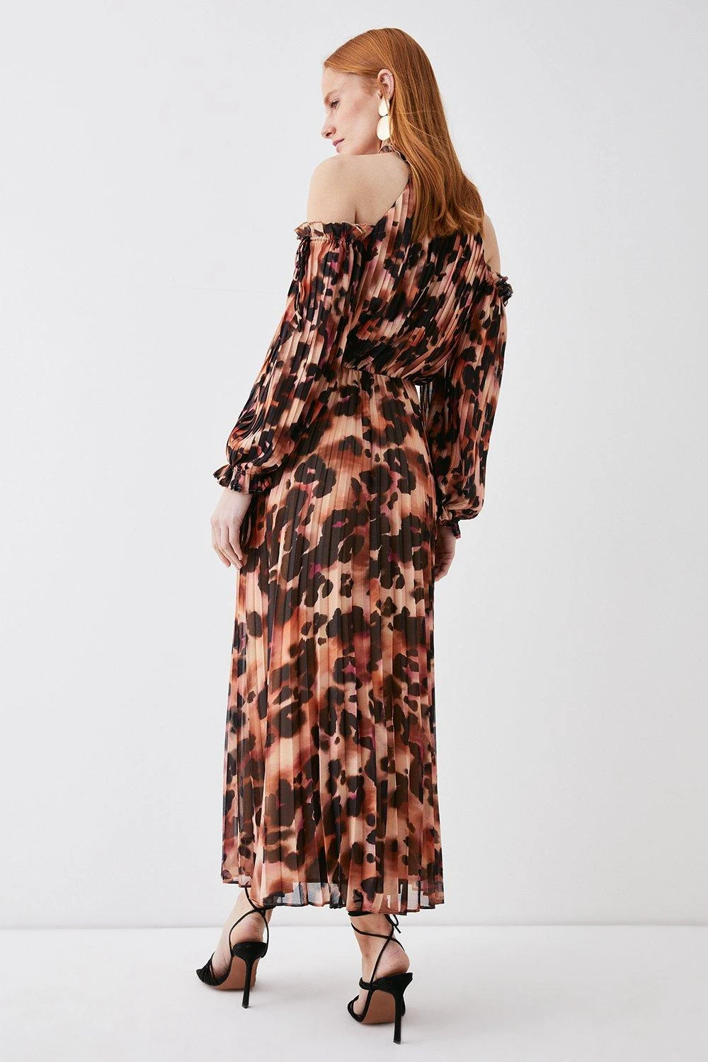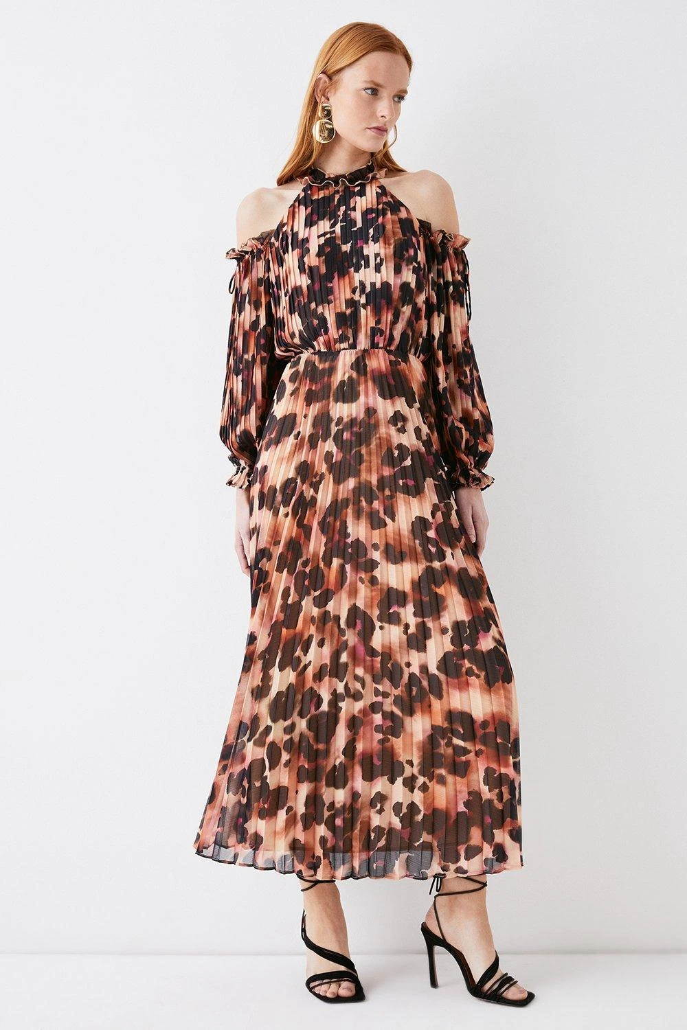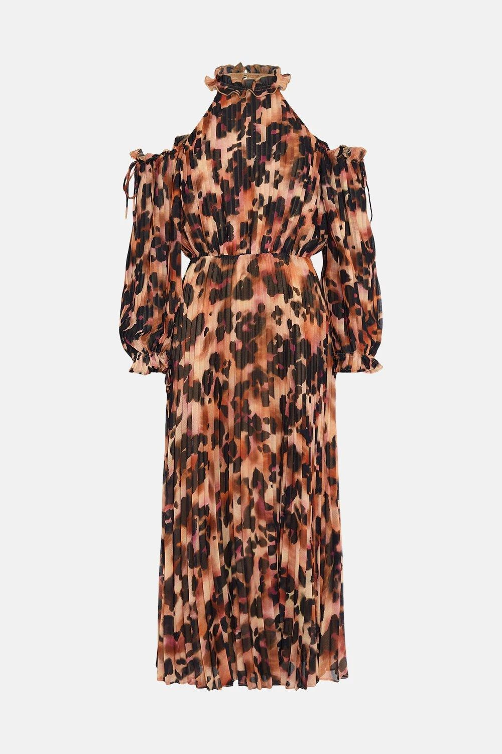 If you love to stand out, look no further. Marrying a vibrant print with cold-shoulder cut-outs and blouson sleeves, this captivating midaxi dress makes a stunning impression at special soirees. Frilled trims and a nipped-in waistline complement the flowing skirt, sharply pressed pleats and arresting colour palette to polished perfection.