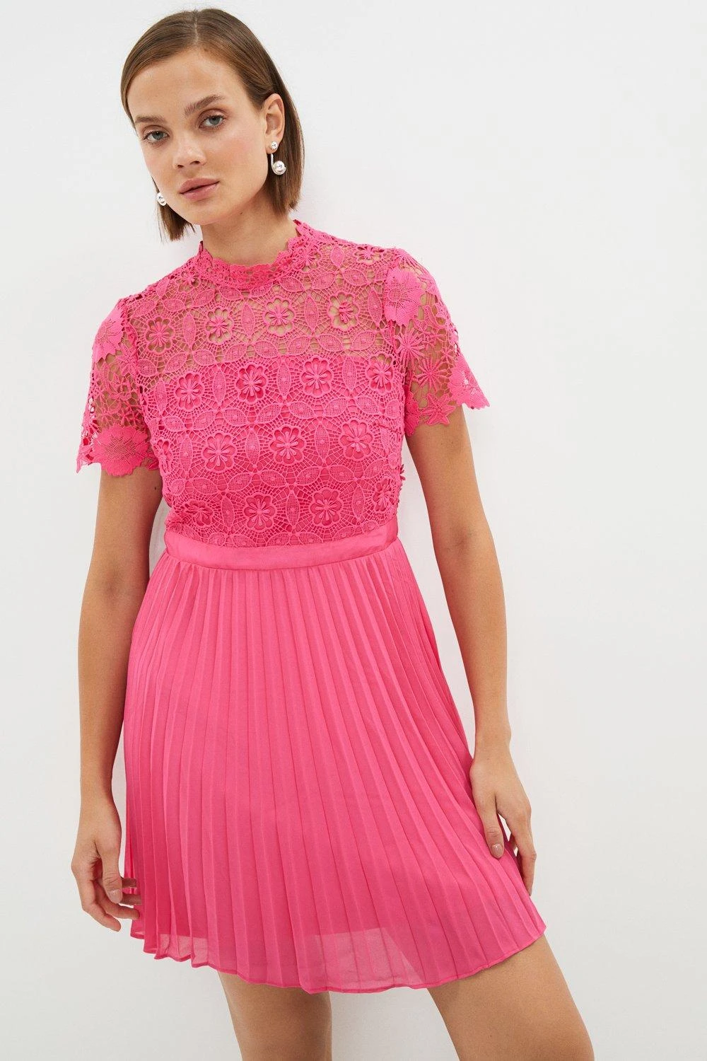 Look pretty in pink in this exceptionally elegant mini dress. It shows off a corded lace bodice that nods to artisanal craftsmanship along with a sharply pleated skirt cut to elongate the legs. Raw-edged lace trims enhance the silhouette, calling out for the addition of pearly accessories or a streamlined silver clutch.