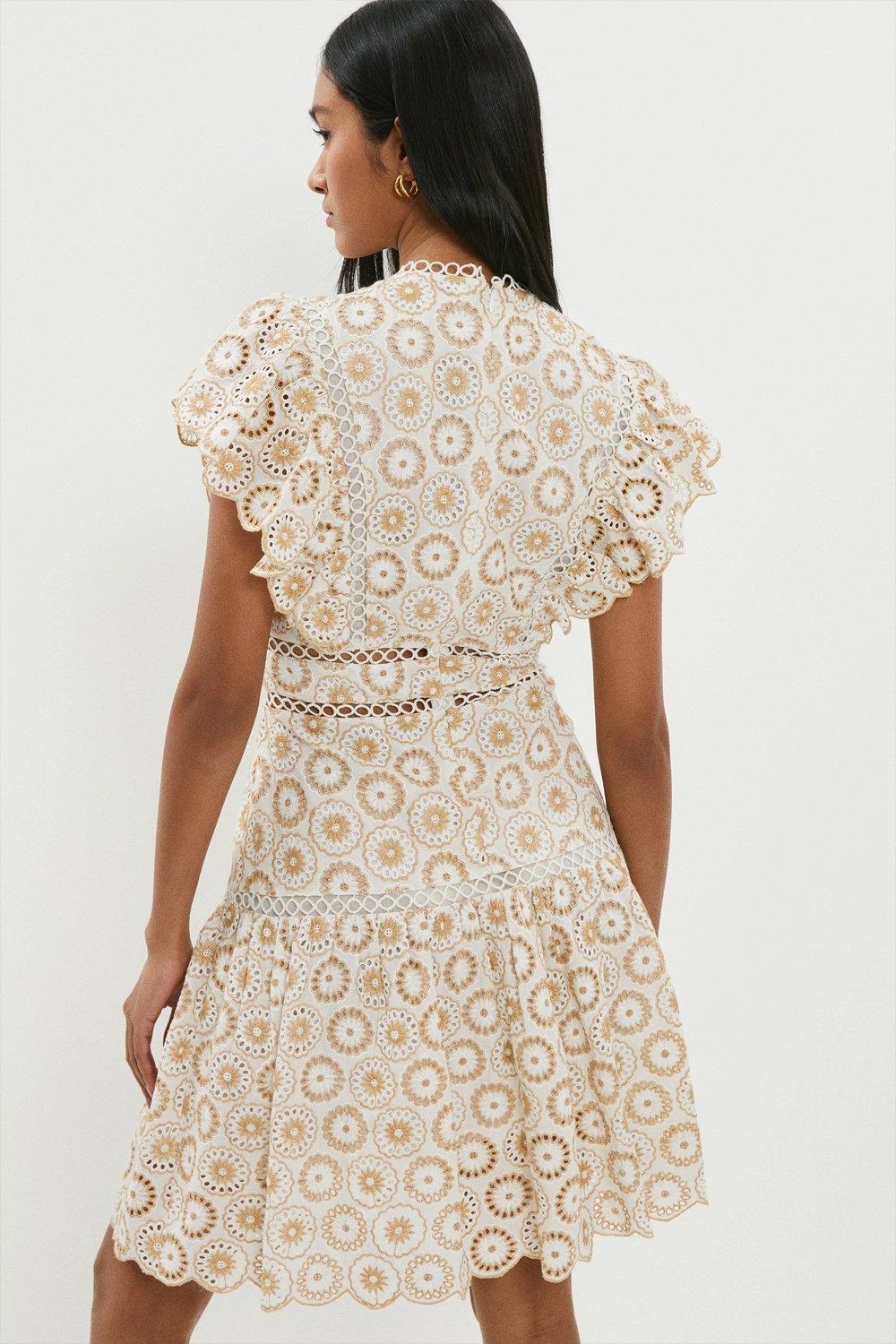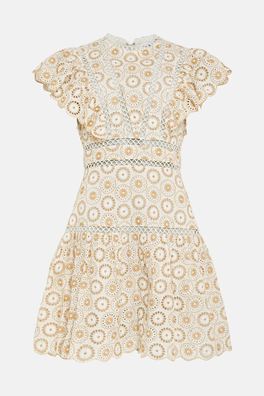 Your shortcut to artisanal allure. Our cotton broderie mini dress shows off exceptional craftsmanship in the form of its rich cutwork detailing, scalloped sleeves and ladder-stitch trims. Enhance the flirty flared skirt with raffia accessories for a rustic, homespun finish.