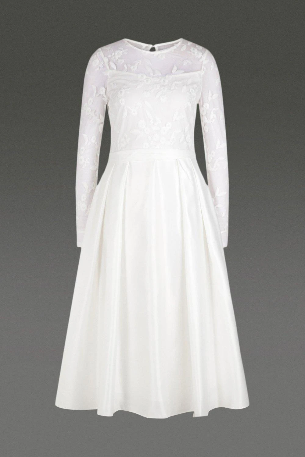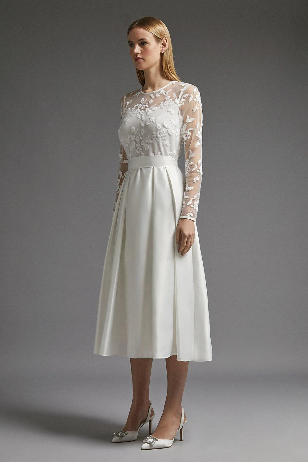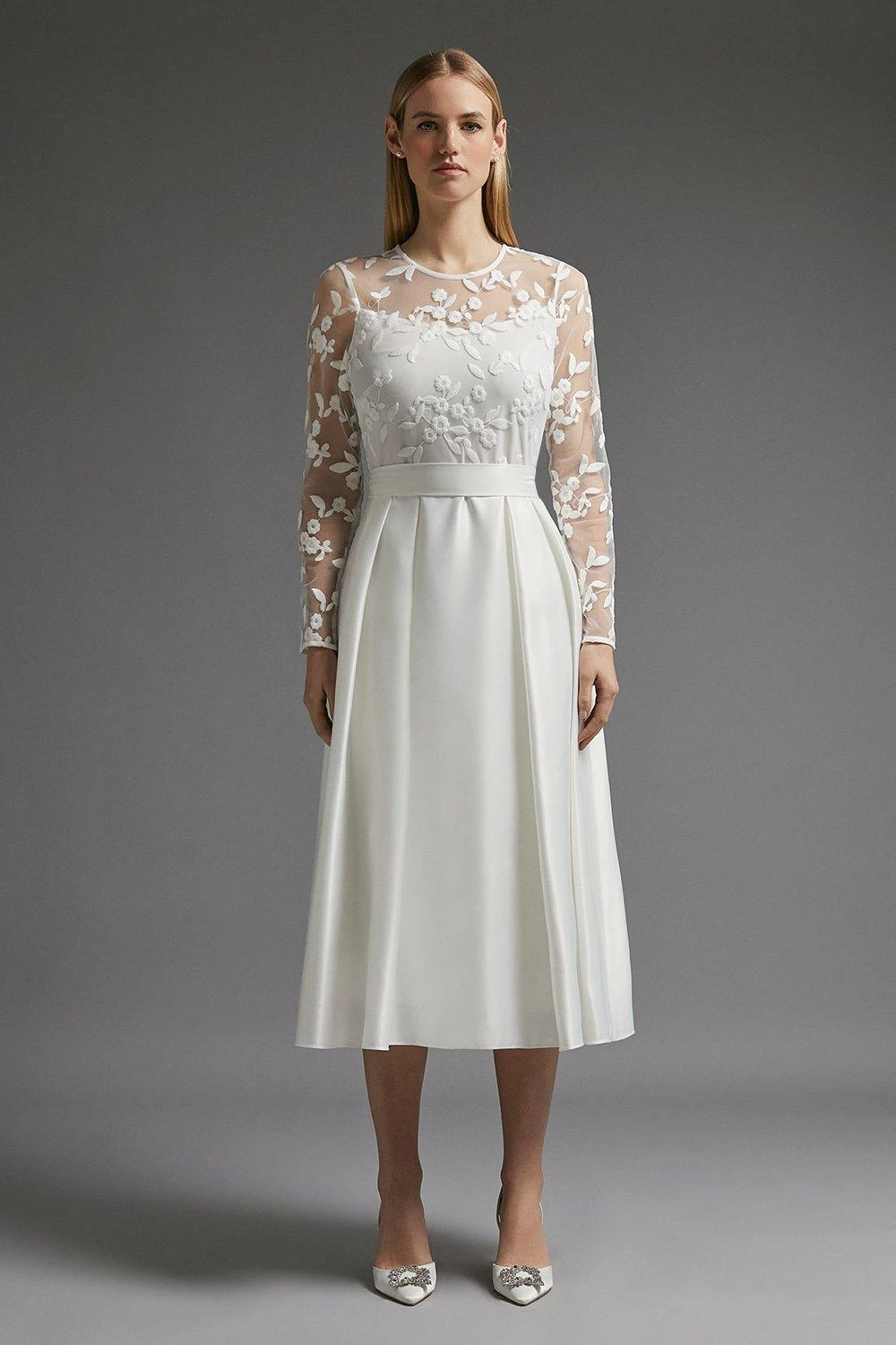 Meet your dream dress. Designed to stun guests on your big day, this magical midi features a ladylike lace bodice, satin bow belt and structured satin skirt. Let the floral motif and ladylike silhouette speak for themselves as you swish demurely up the aisle.