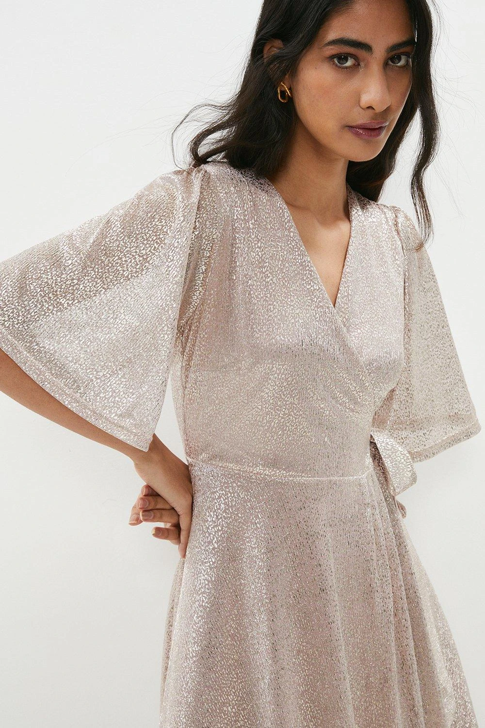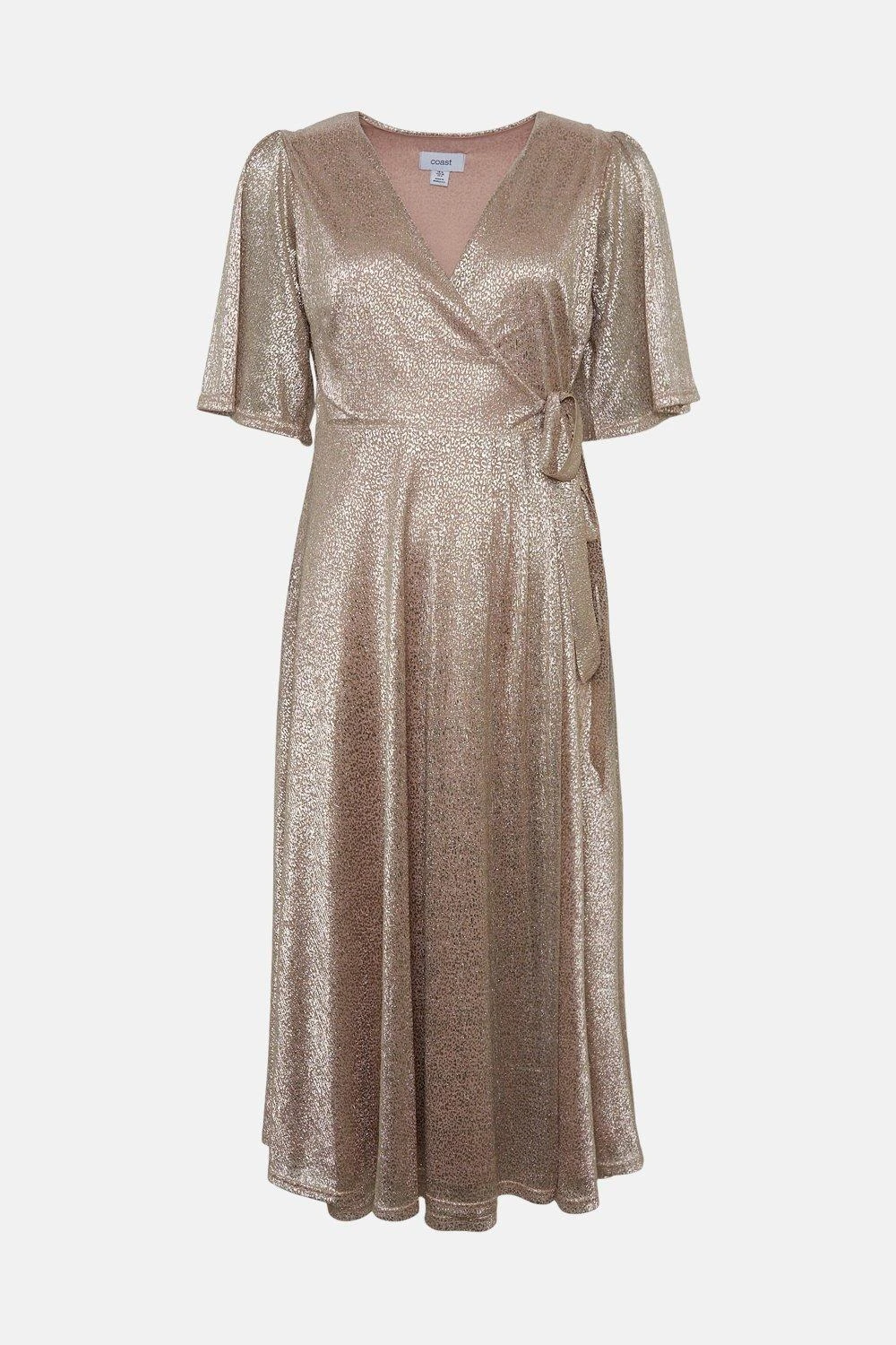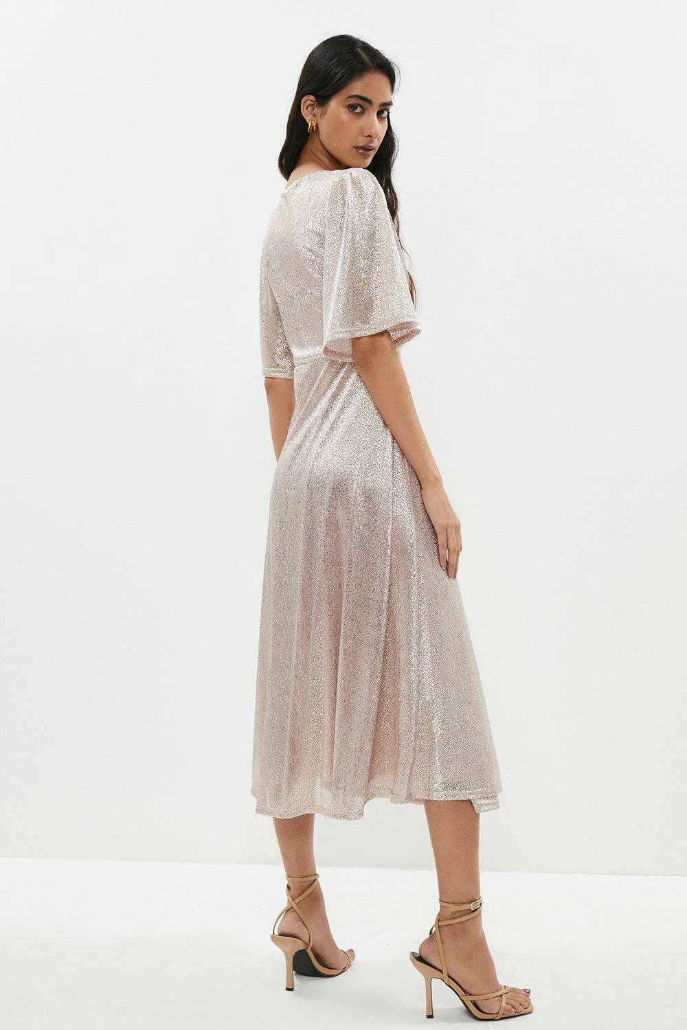 Embody retro glamour with this flowing metallic midi dress. Cut in a wrap-over style that’ll both highlight and skim over the bust, the piece is finished with a tie-belt to emphasise your waist to perfection. Angel sleeves also flow over the arms an ultra-flattering look. Wear with metallic strappy heels to complement the fabric’s glistening thread.