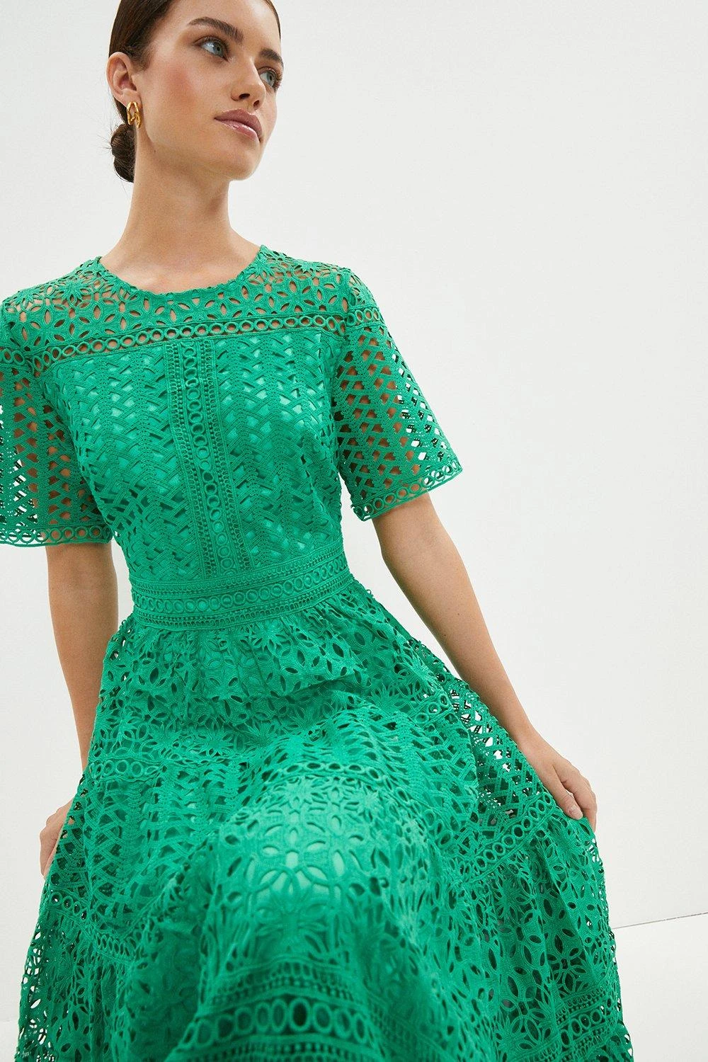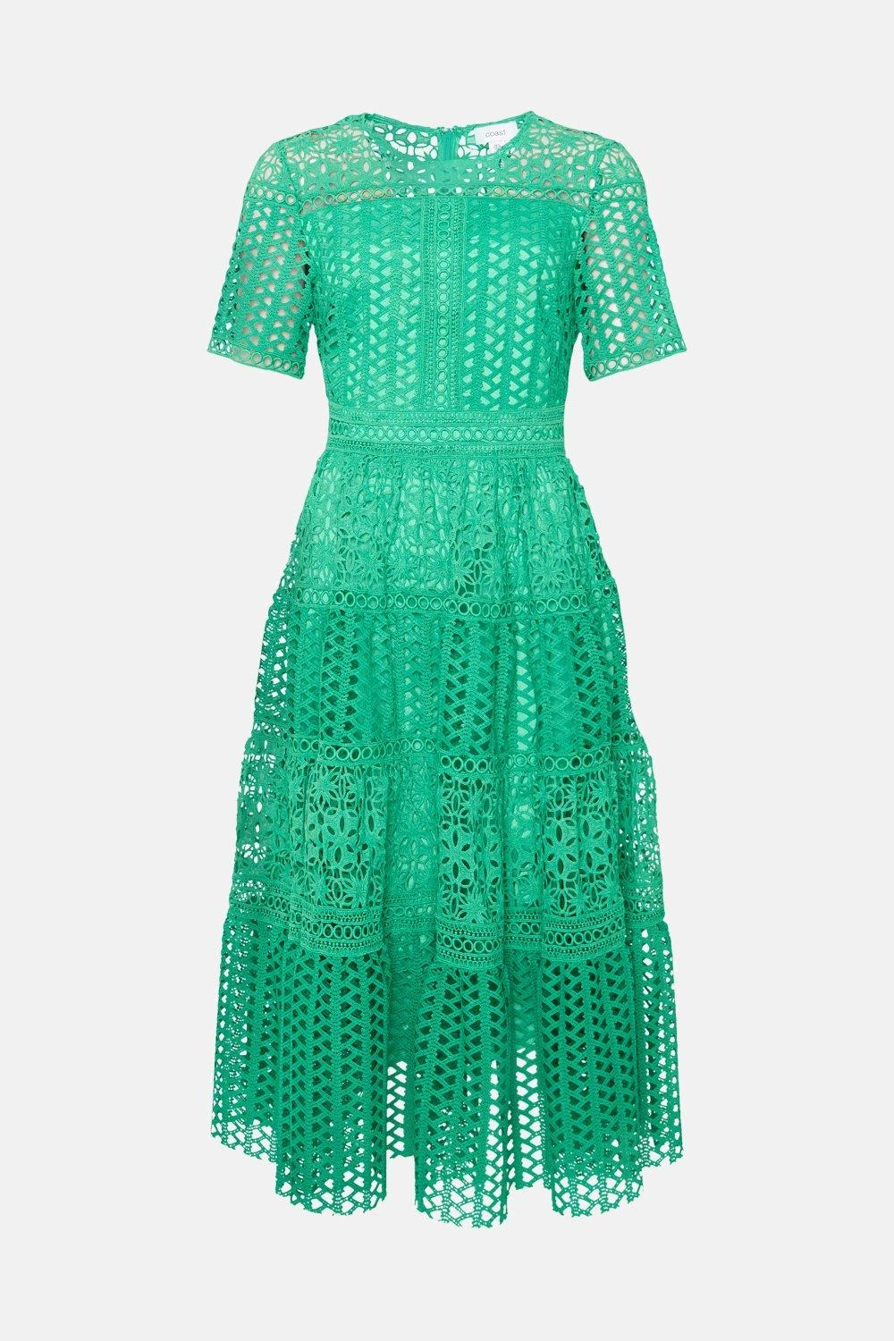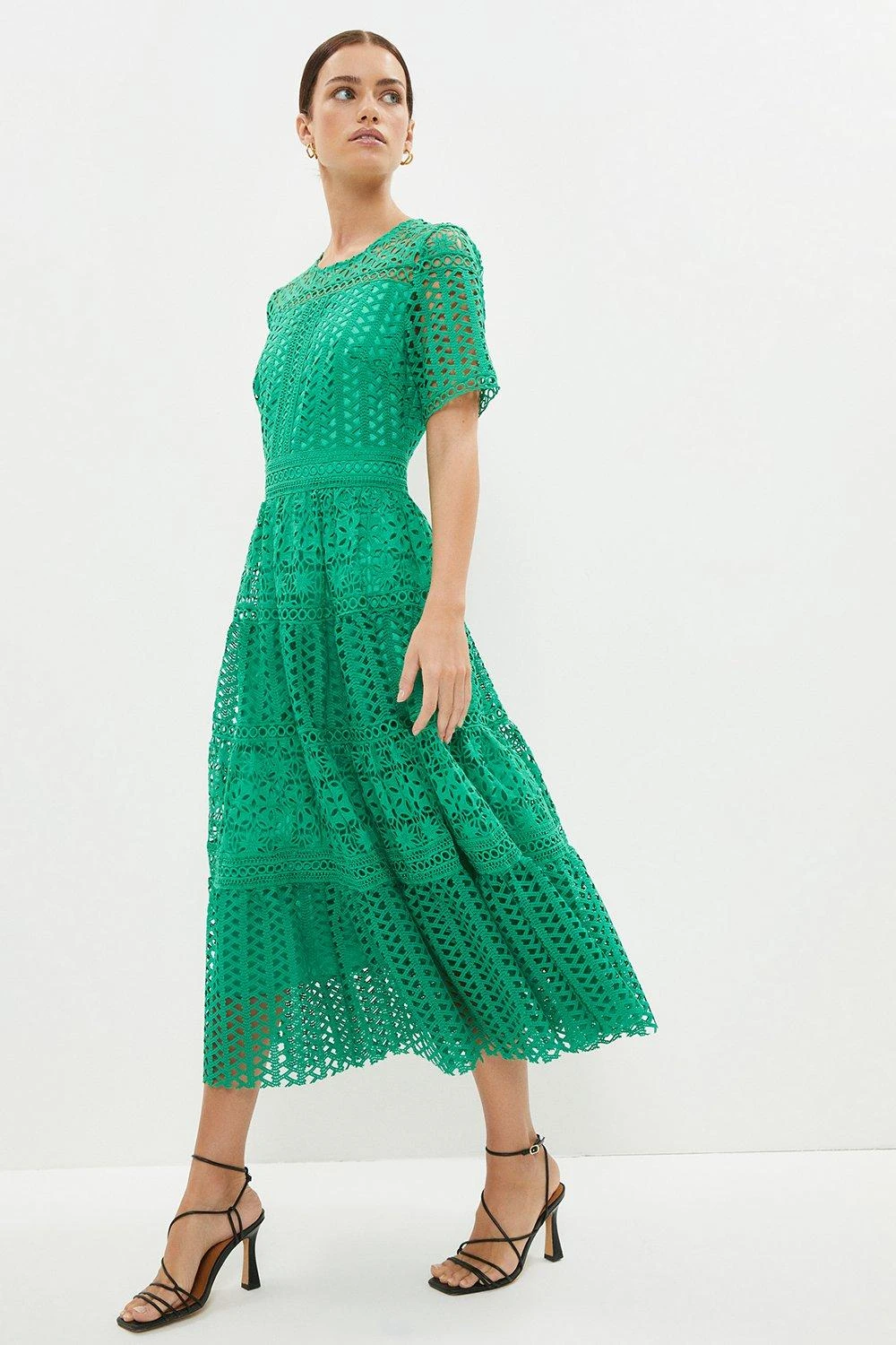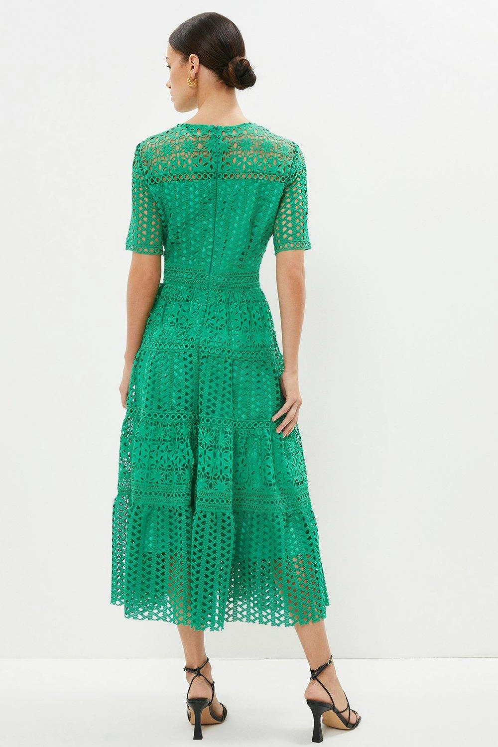 Choose this romantic lace dress when hoping to make a lasting impression. Detailed with a lacy, cutwork pattern and tasteful tiers that cascade down to the ankle, this short-sleeved design is both feminine and fashion-forward. Elevate the ladylike silhouette with chunky platform heels for a modern twist.
