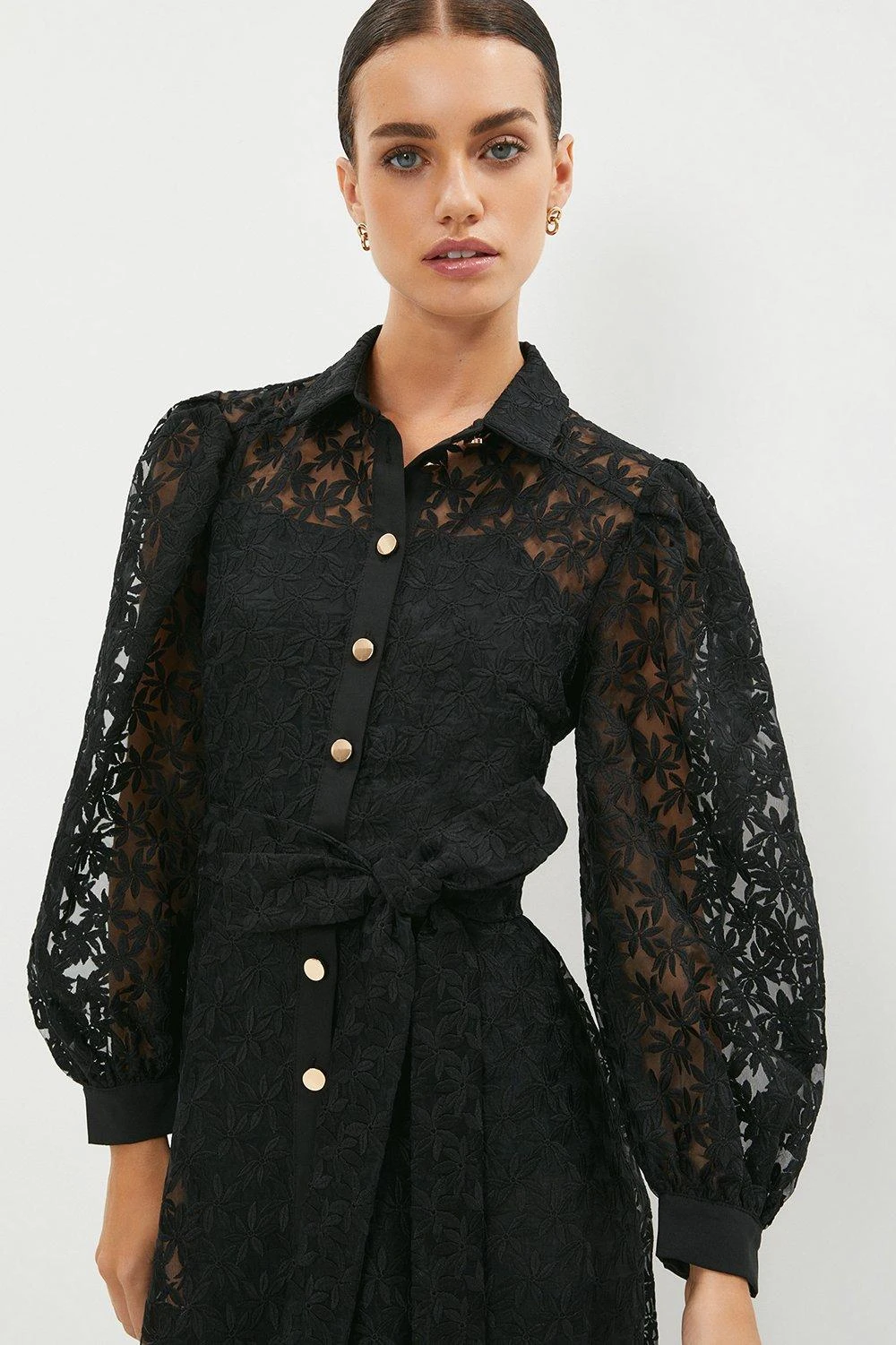Make a fashion statement in this gorgeous shirt dress. Designed in textured organza and cut to a classic mid-length with puff sleeves, it boasts a super flattering cinched-in waist and is offset with glossy gold-toned buttons.
