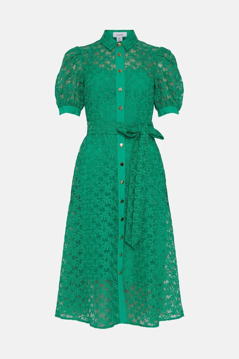 With its retro 1950s silhouette and gorgeous floral overlay, this collared midi dress exudes vintage glamour. Neat buttons and a matching waist tie lend polished charm to a dress with endless styling potential.
