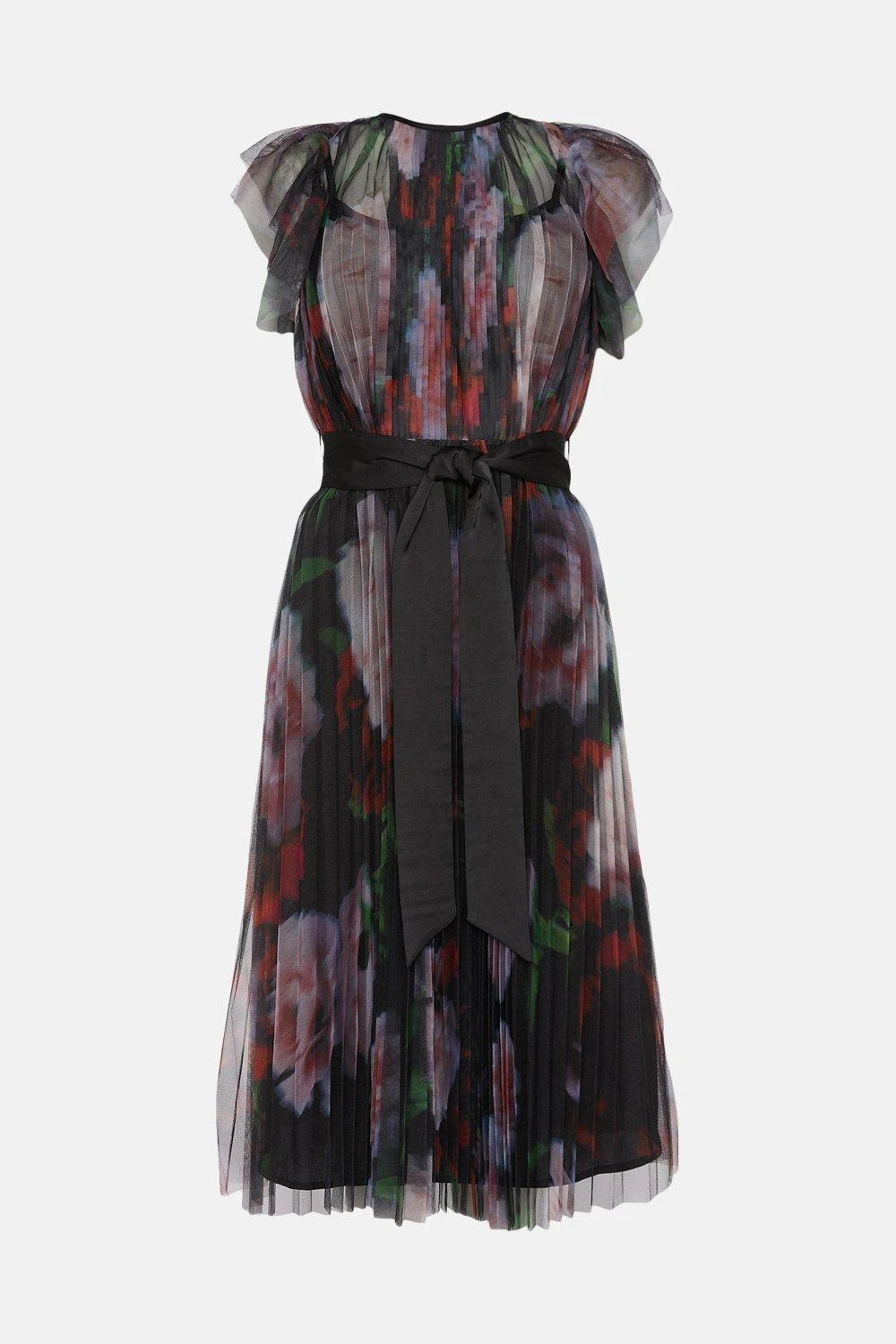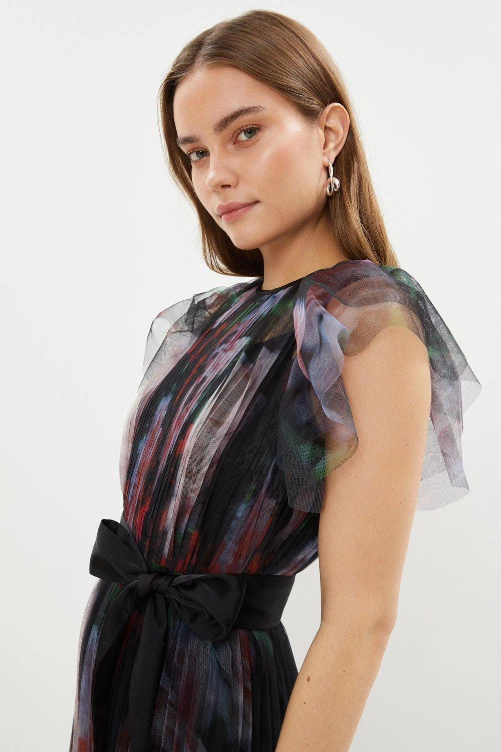 Feminine glamour, guaranteed. Detailed with an all-over floral print and frothy sleeves, this swishy mesh dress adds ladylike allure to special occasions and comes finished with a silky satin bow to define your waistline.