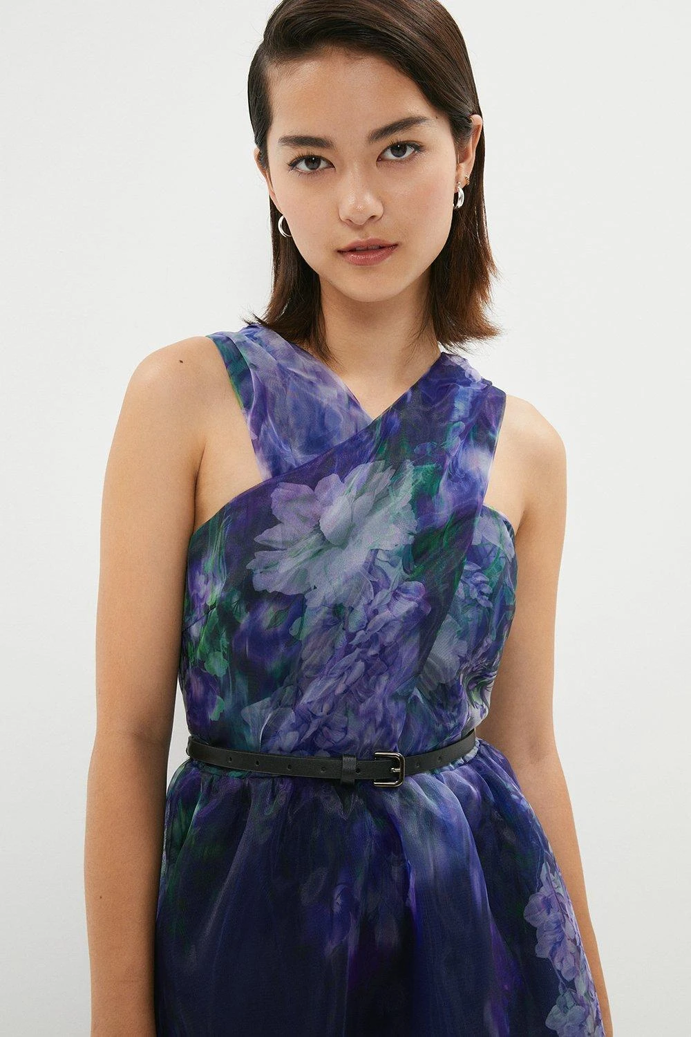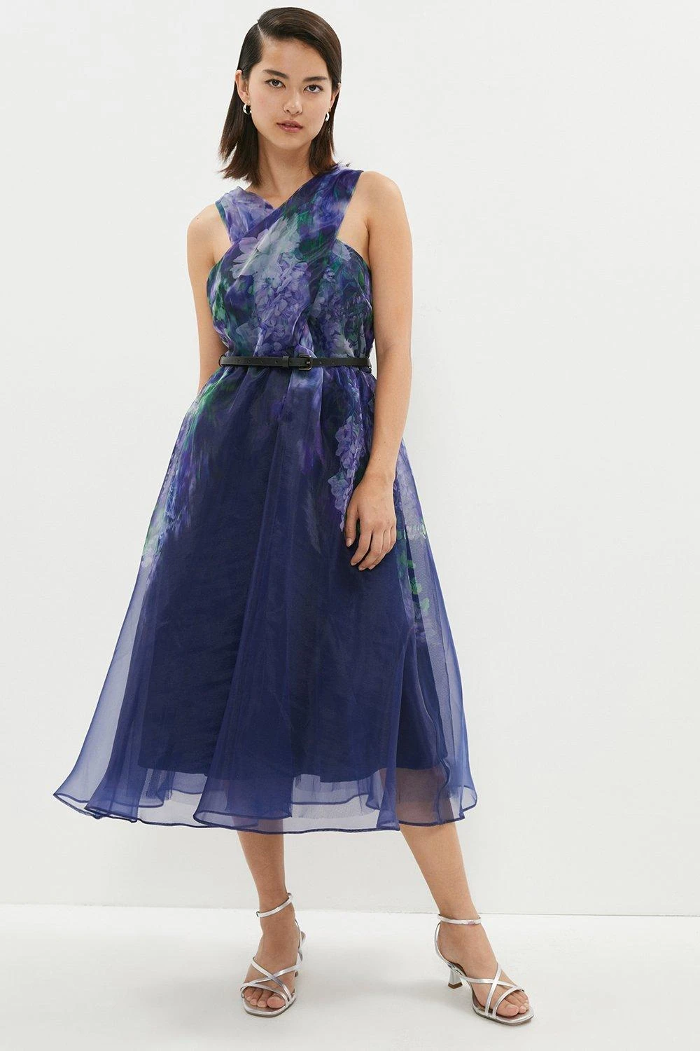 A floral dress with an edge. Proving that opulent floral patterns work anywhere and everywhere, its eye-catching organza finish is both modern and romantic. The piece also features a fitted wrap halter-neck bodice, slender buckled belt and flowing midi skirt.