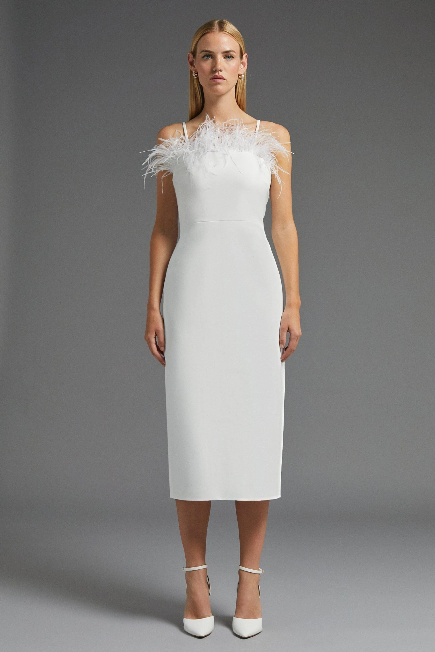 A sophisticated melange of feathers and fabric ensure this sleek pencil dress is one to watch for wedding season. Framing the decolletage with its flamboyant feathered trim, there’s no need for a necklace with this scene-stealing piece. Elevate the simple, form-fitting silhouette with strappy ivory heels for your walk down the aisle.