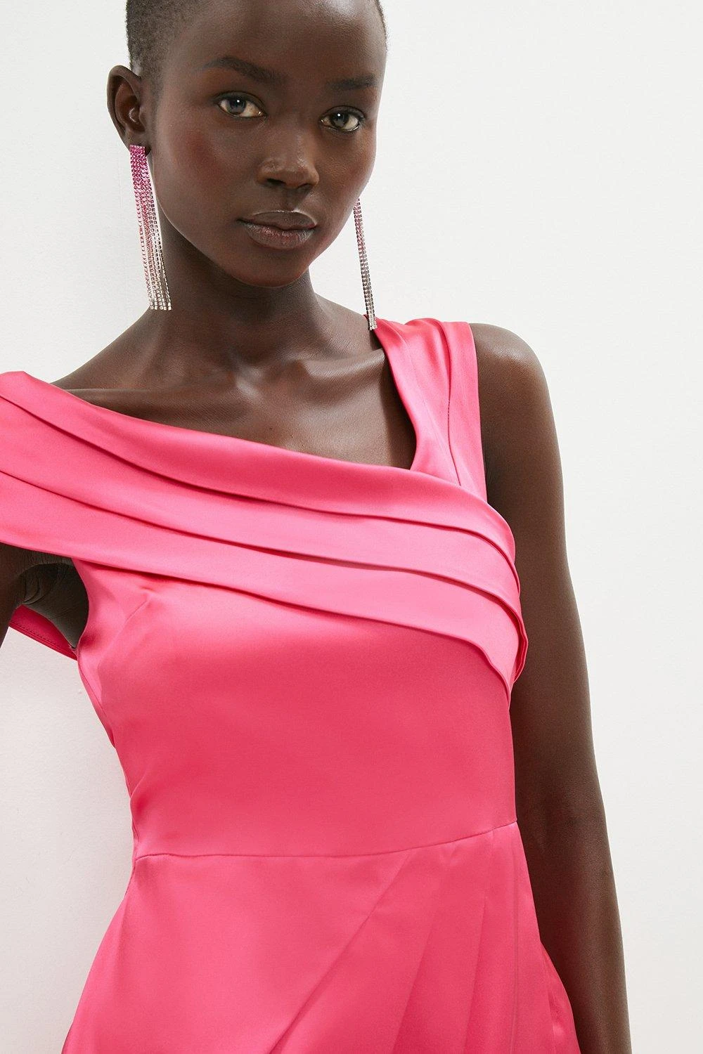 The lustrous depth of satin is elevated further with the captivating construction of this statement-making midi dress. A bold composition that scintillates with tactile depth, it balances a wrapped, asymmetric neckline with the soft pleats of a tulip-shaped skirt. Pair this piece with gold wrap stilettos that offset the molten warmth of its colour palette.